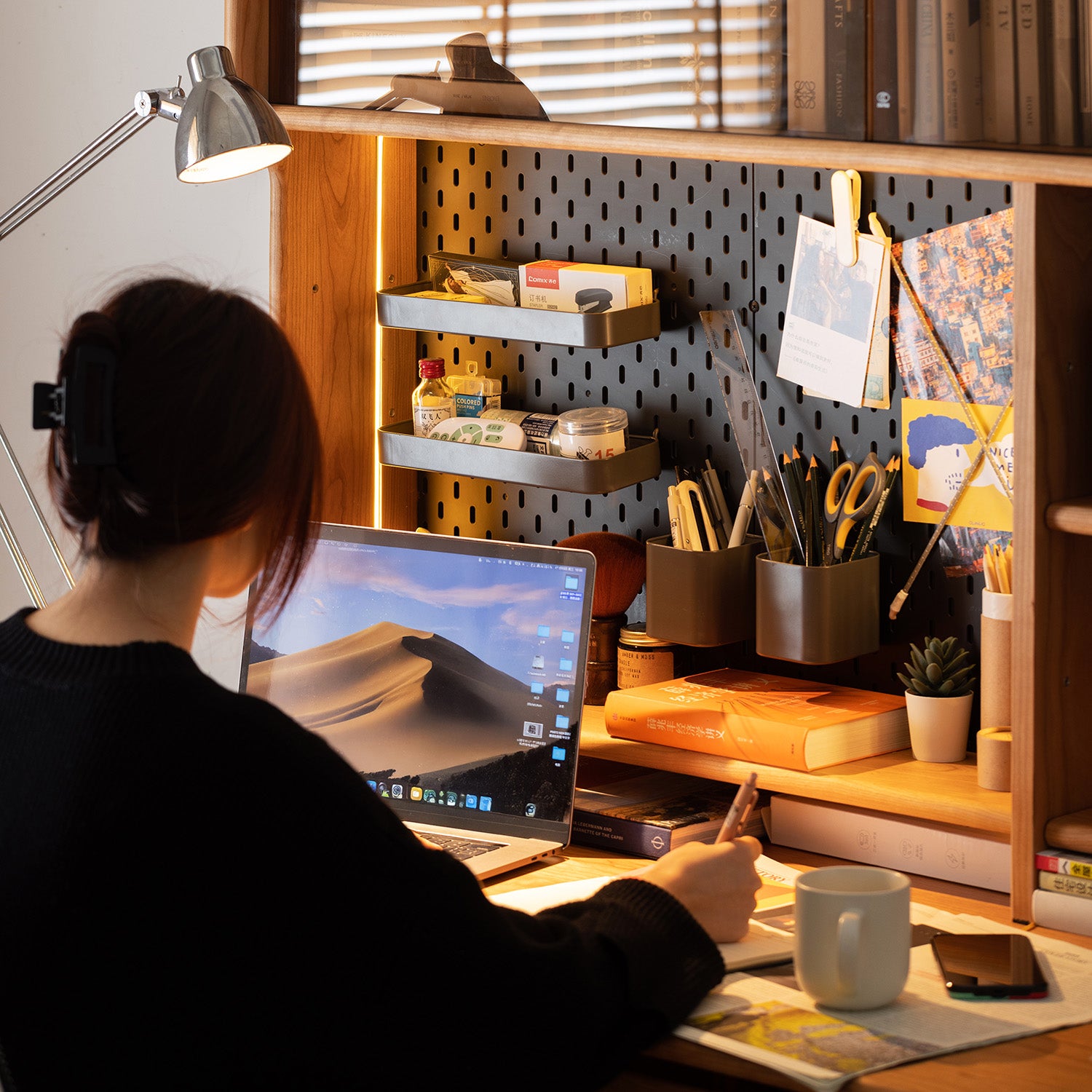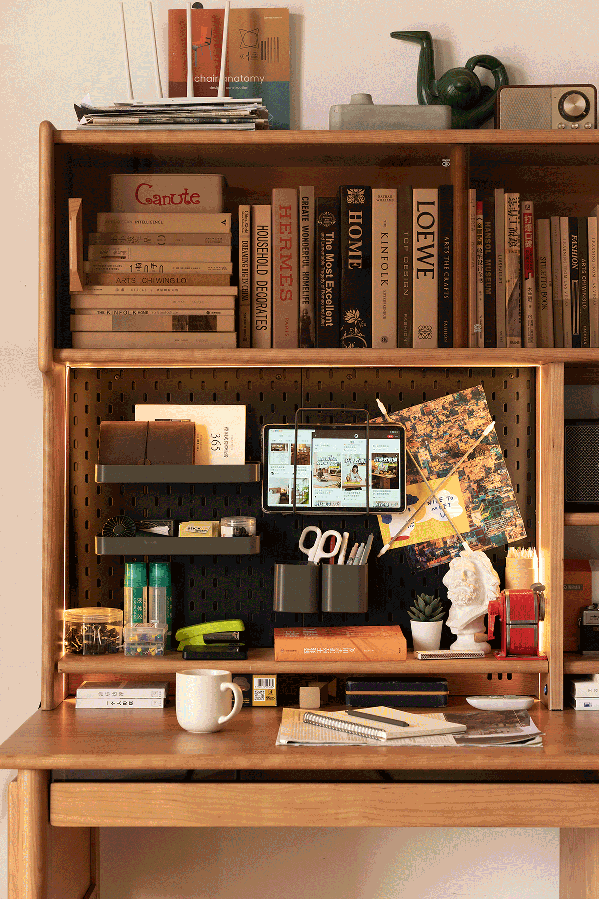 Scandinavian cherry wood study table with shelf cape in panoramic view.
