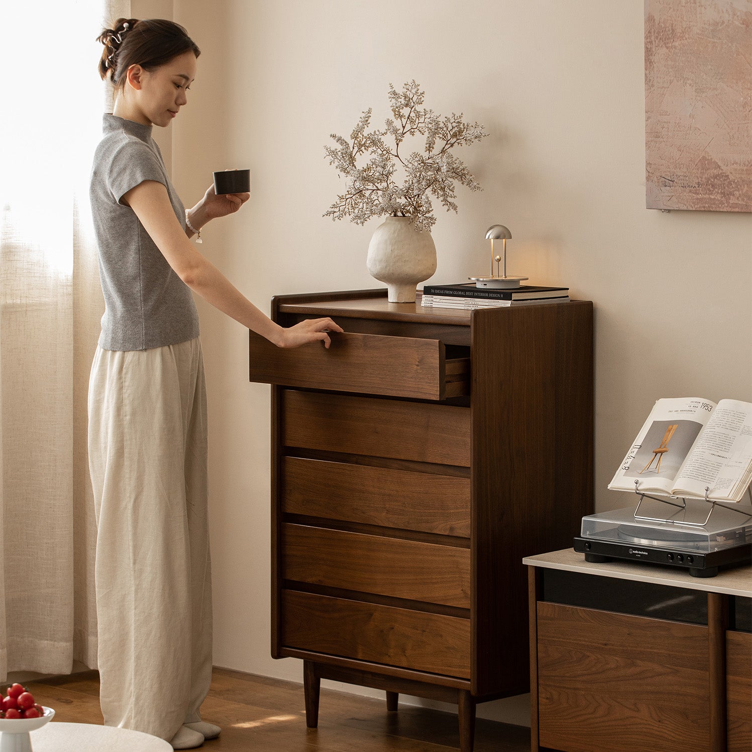 Vintage Walnut Wood Chest Of 5 Drawers VISTA delivers spacious storage, smooth drawer movement, and rich walnut tones, adding timeless elegance and practical organisation to your home.