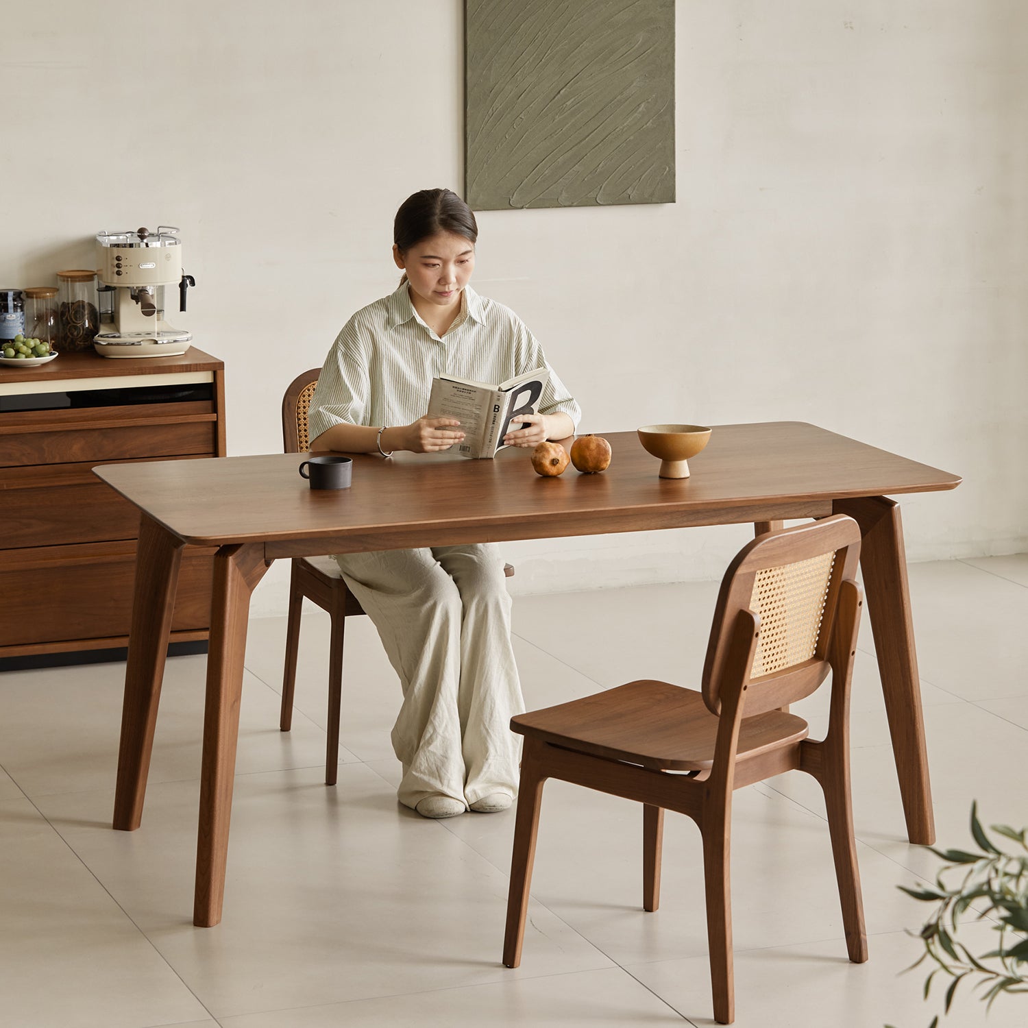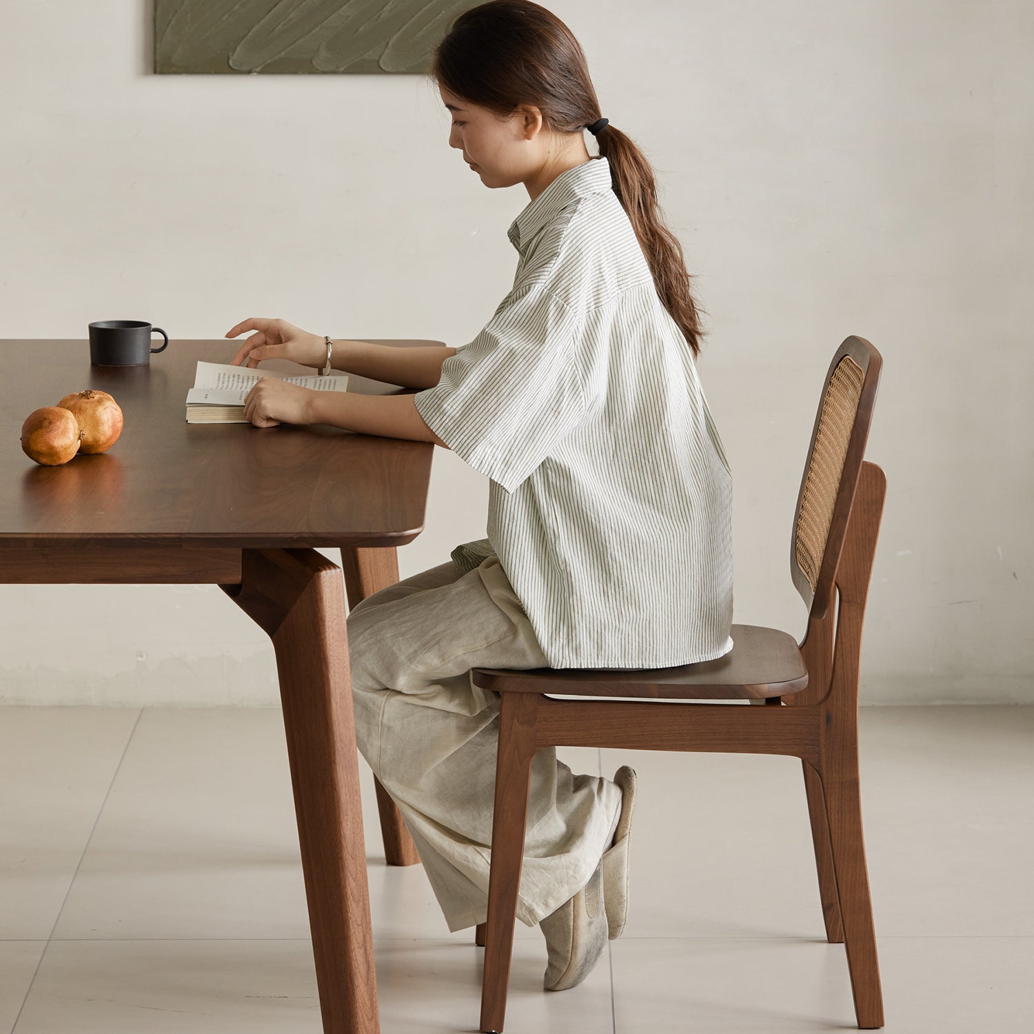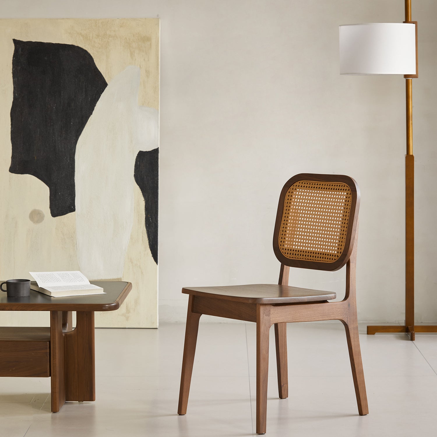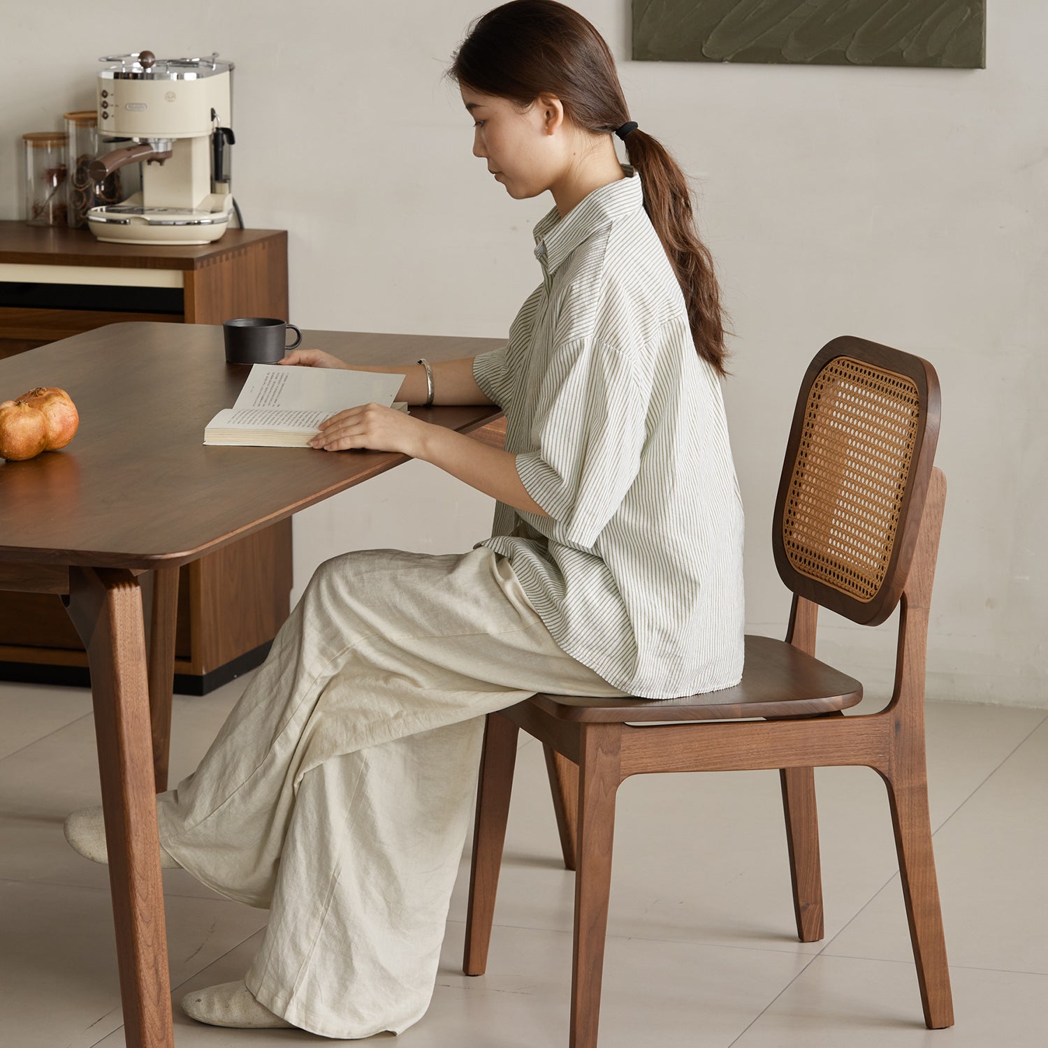 Made with rich walnut wood and delicate rattan weaving, this chair brings a warm vintage charm that enhances any dining space with natural beauty and timeless appeal.
