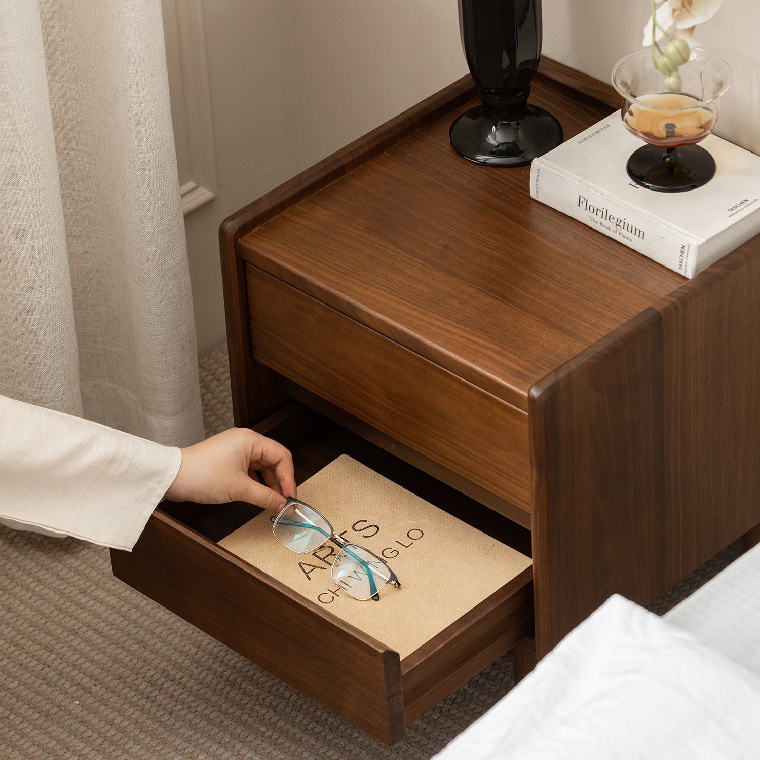 Japandi Walnut Wood Side Table VISTA brings solid walnut warmth and calm Japandi elegance with a compact design made for modern everyday living.