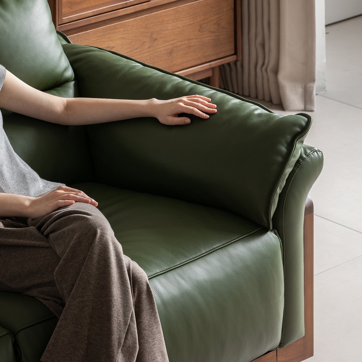 Blending warm walnut wood tones with clean minimalist lines, this sofa brings calm Japandi elegance that complements modern and natural interiors.