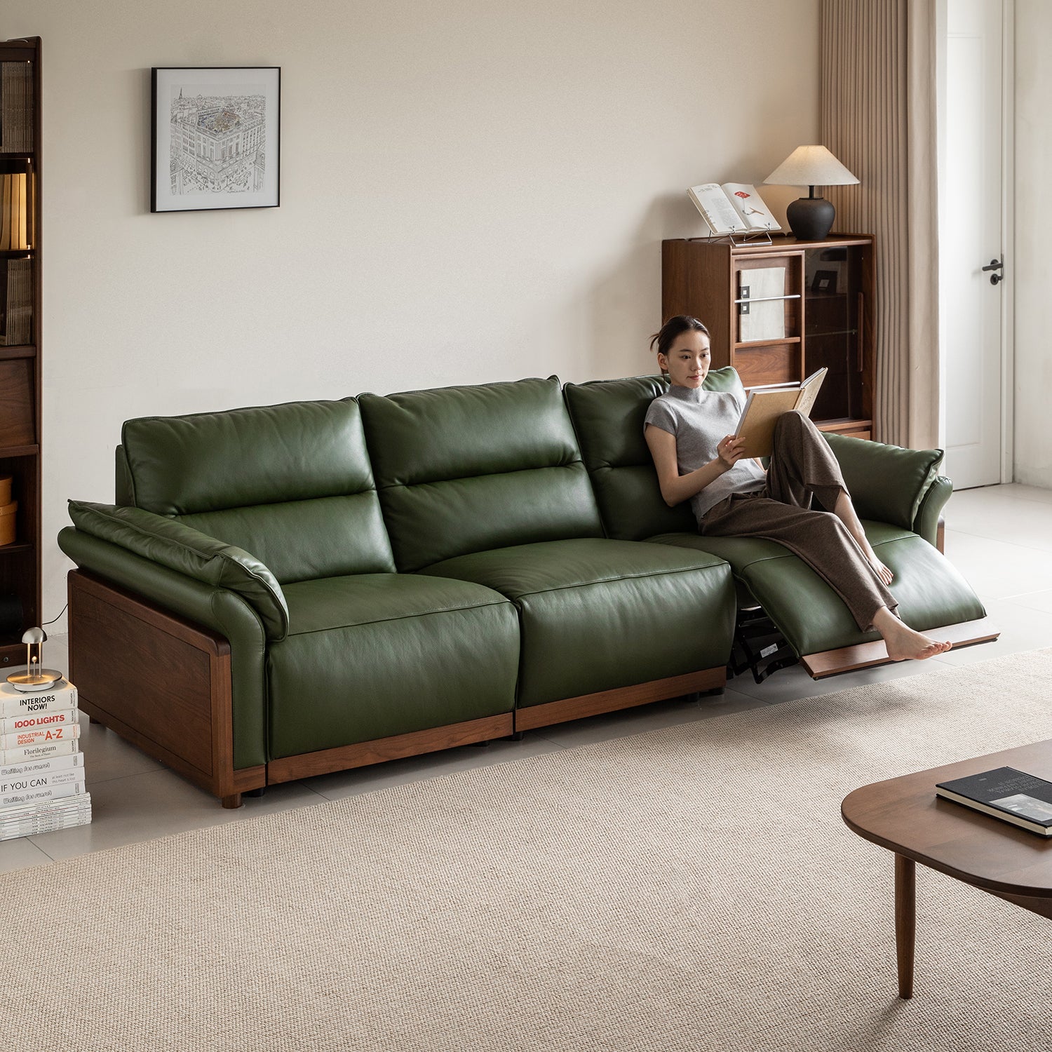 Japandi Walnut Wood Genuine Leather Electric Recliner 4 Seater Sofa EDGELESS
