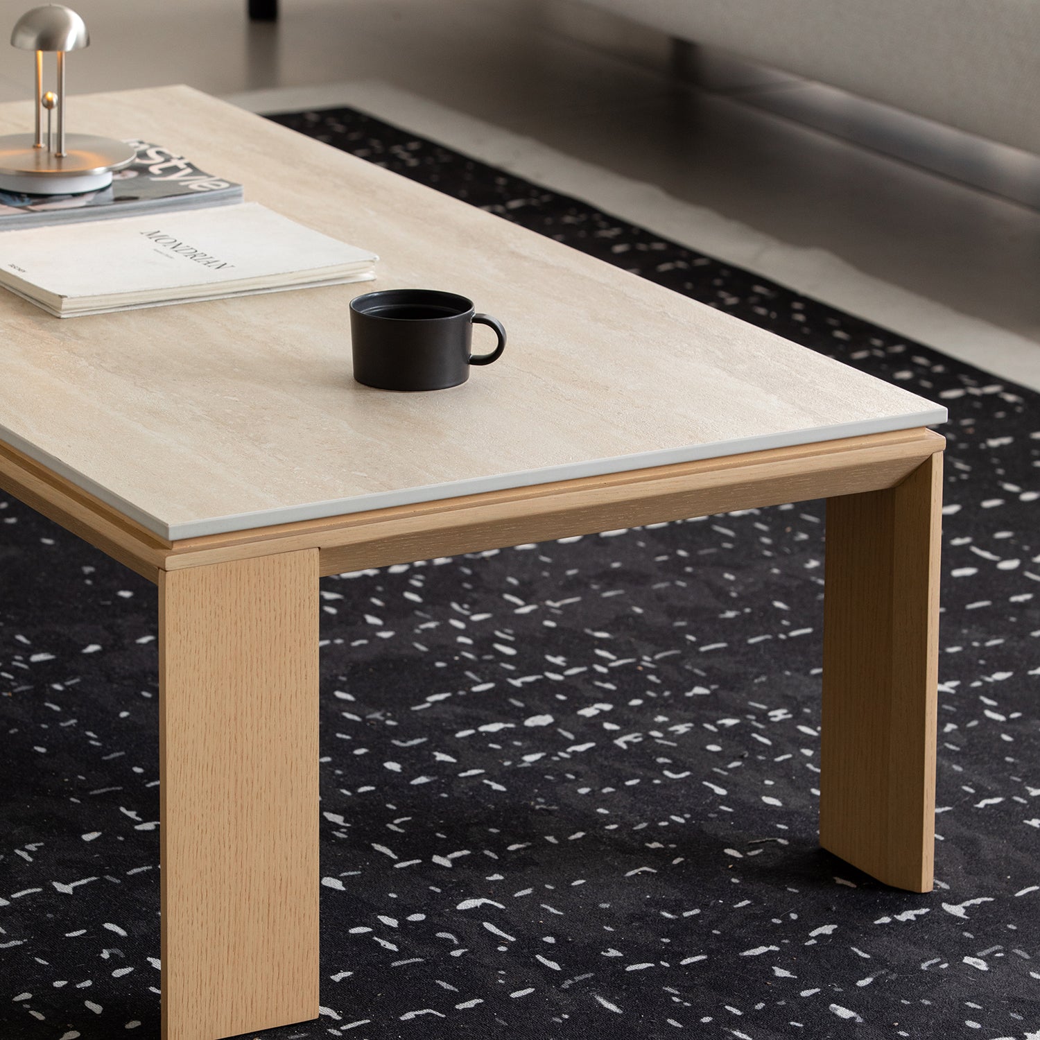 Minimalist Ash Wood Veneer Sintered Stone Coffee Table STRING pairs durable sintered stone with warm ash wood tones to create a refined and practical centerpiece for modern living spaces.