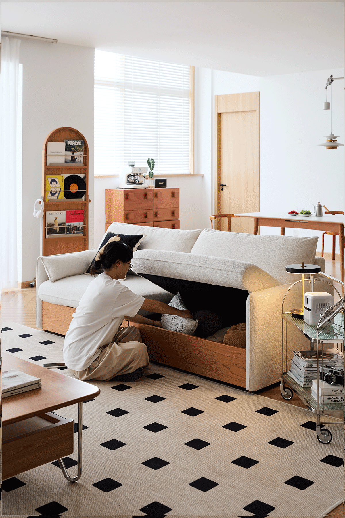 Japandi Boucle Fabric Pine Wood Storage 2 Seater Sofa KANGAROO features 266L hidden storage, deep cushioned seating, and soft boucle fabric—perfect for cozy living in compact spaces.