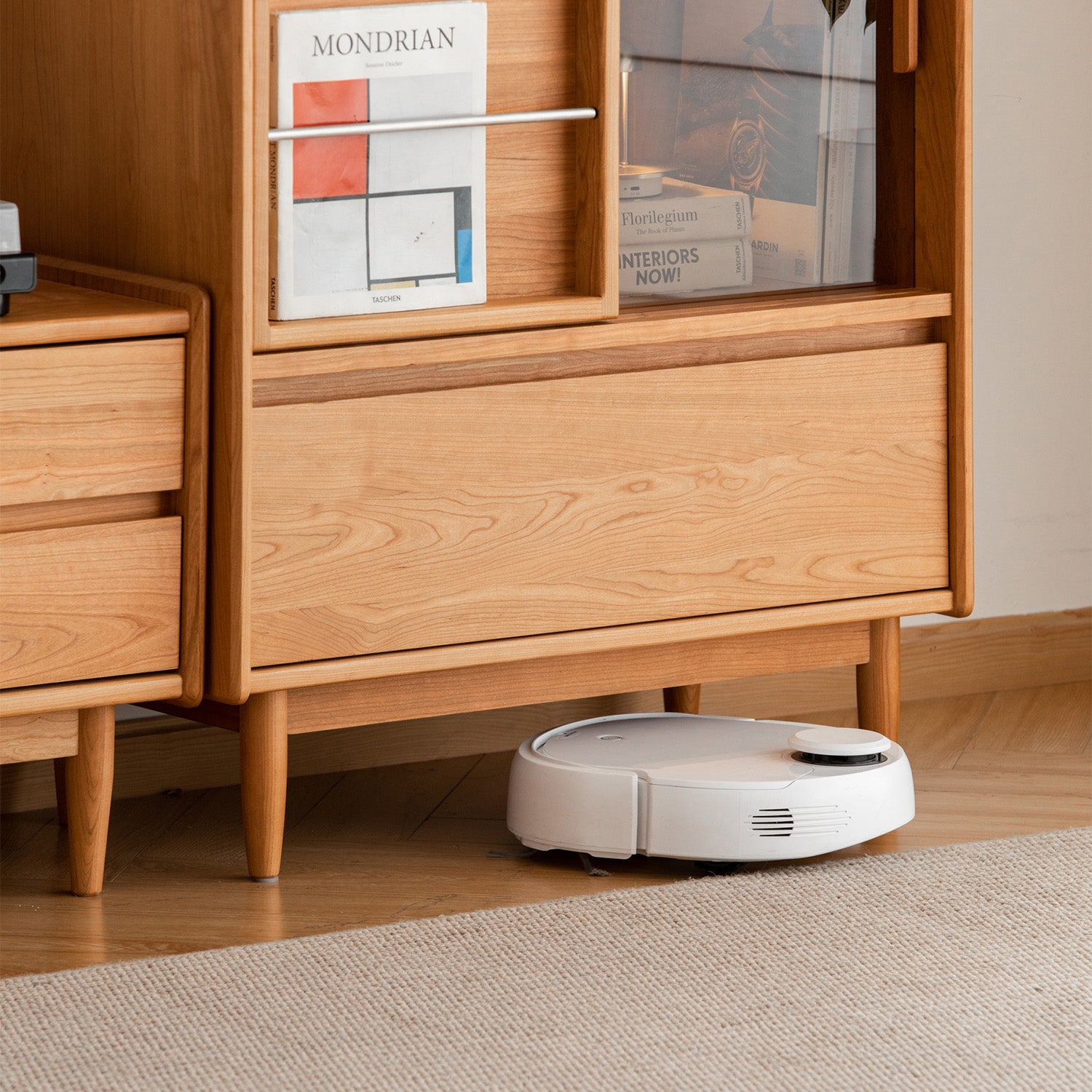 The cabinet is crafted from solid cherry wood, offering natural warmth, rich grain, and long lasting durability that feels reassuringly sturdy for everyday home use.