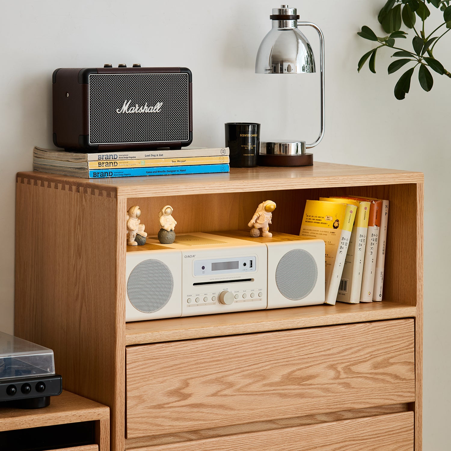 Scandinavian oak wood chest of 5 drawers floating light primary product view.