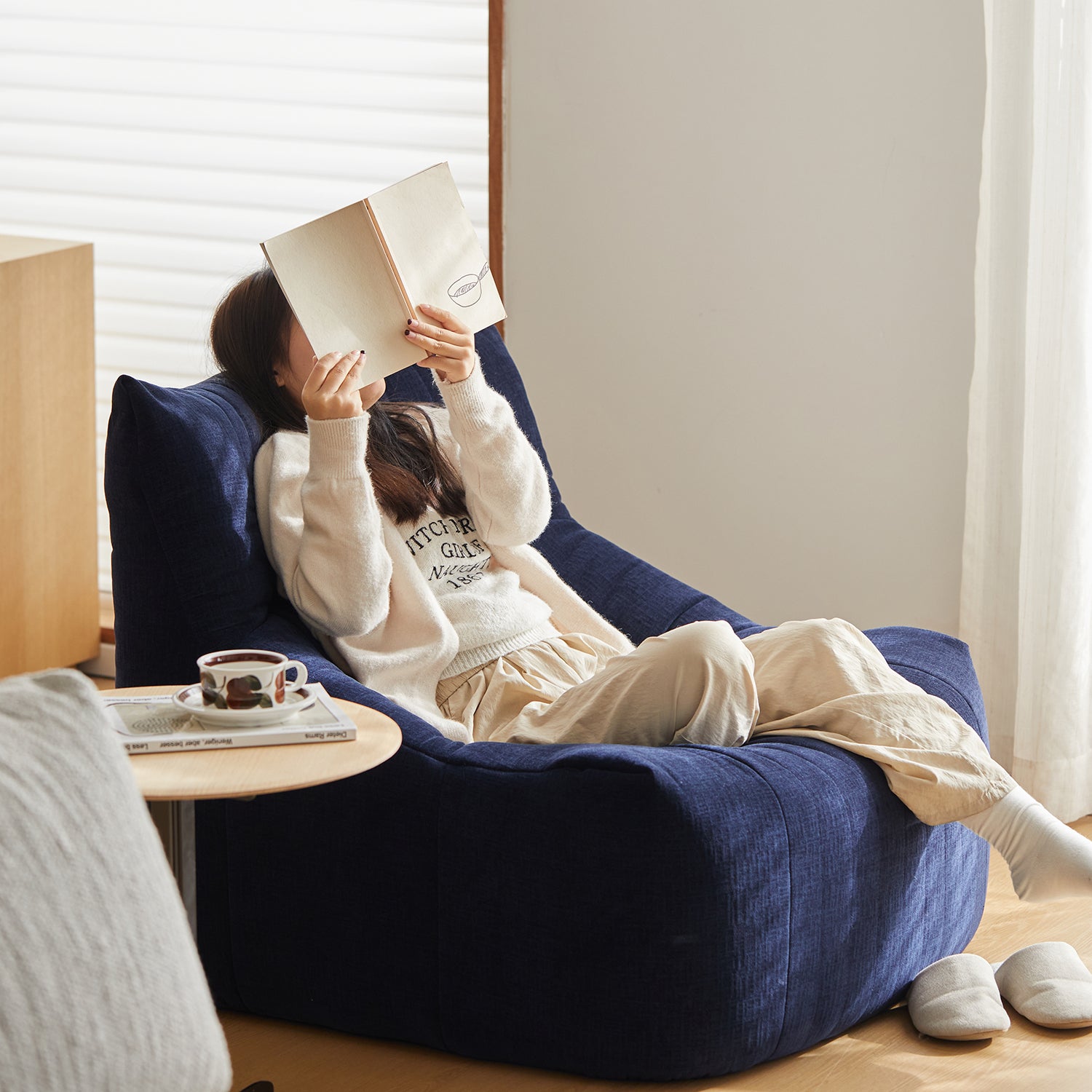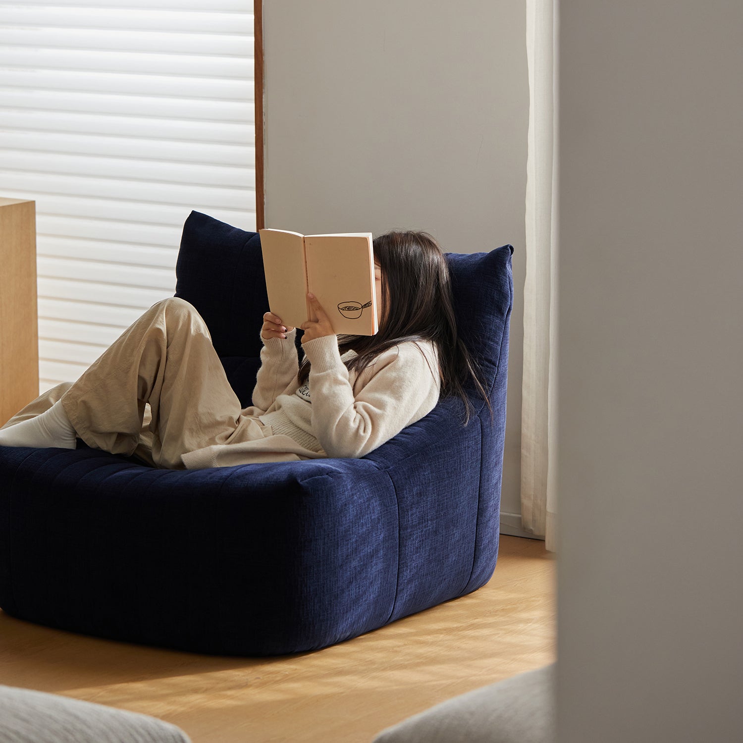 Minimalist chenille velvet fabric 1 seater sofa kait in real life style.