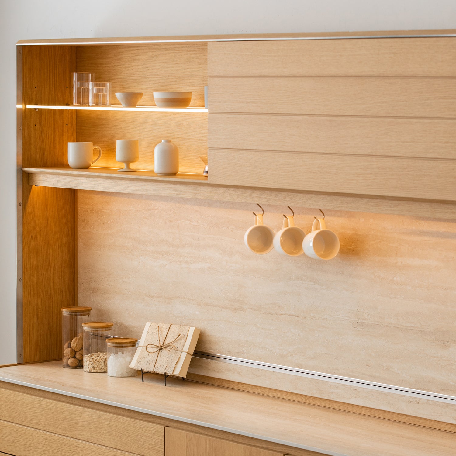 Made with ash wood veneer that brings out a warm, natural grain, giving your kitchen a calm and timeless look that fits both modern and minimalist homes. |