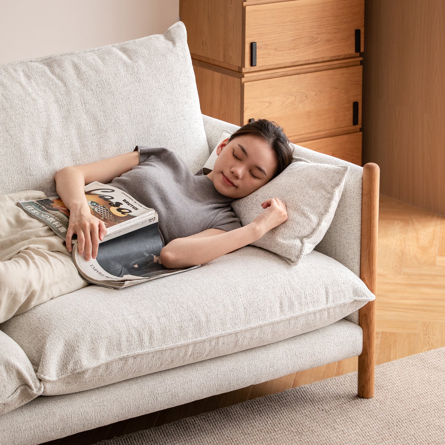 Scandinavian Chenille Velvet Fabric Cherry Wood 3 Seater Sofa SEA SALT offers breathable comfort, refined style, and durable cherry wood craftsmanship for a cozy living room that feels inviting and elegant.