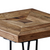 They contrast old elm wood’s rich texture with sleek modern black metal hairpin legs . |