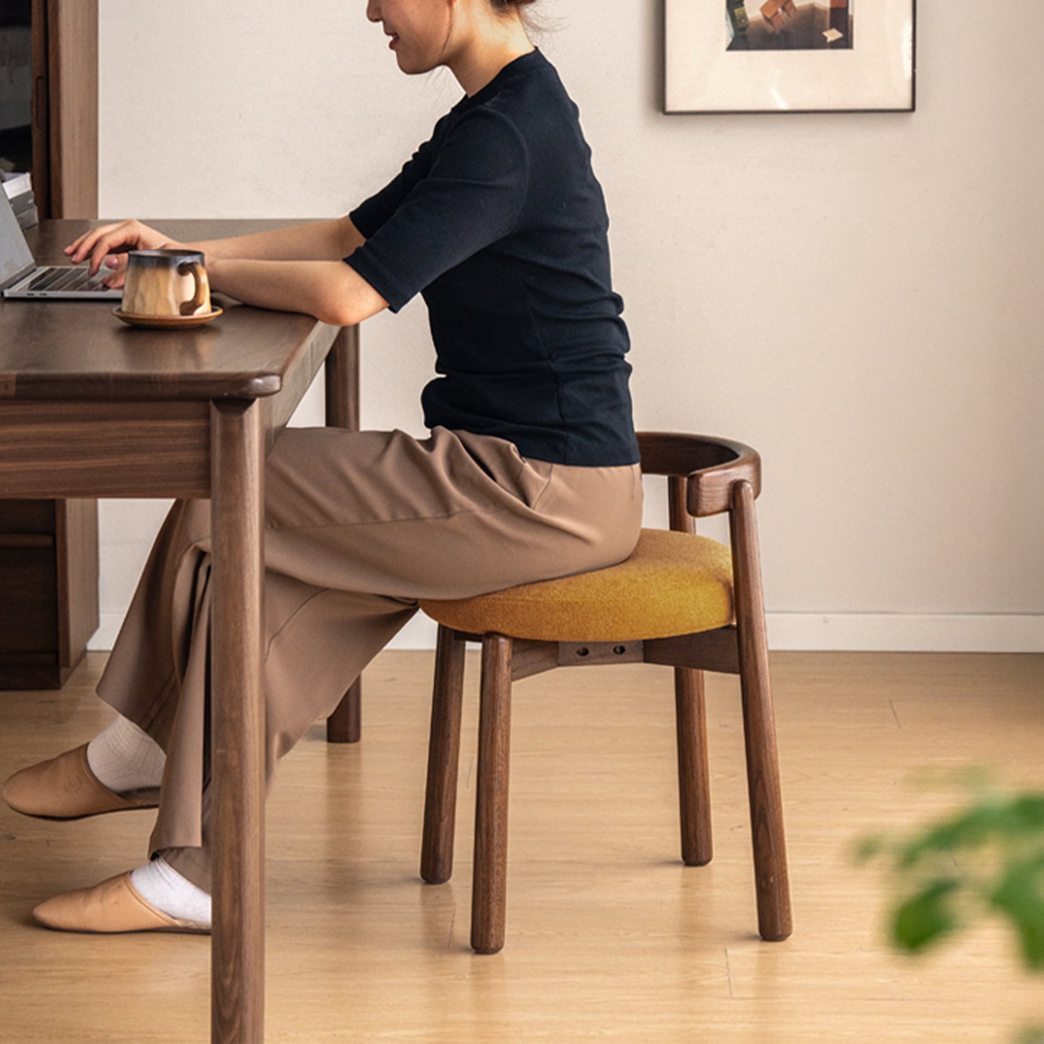 Crafted from solid oak wood with soft boucle fabric upholstery, this dressing chair offers lasting durability with a warm natural look that complements modern Singapore homes.