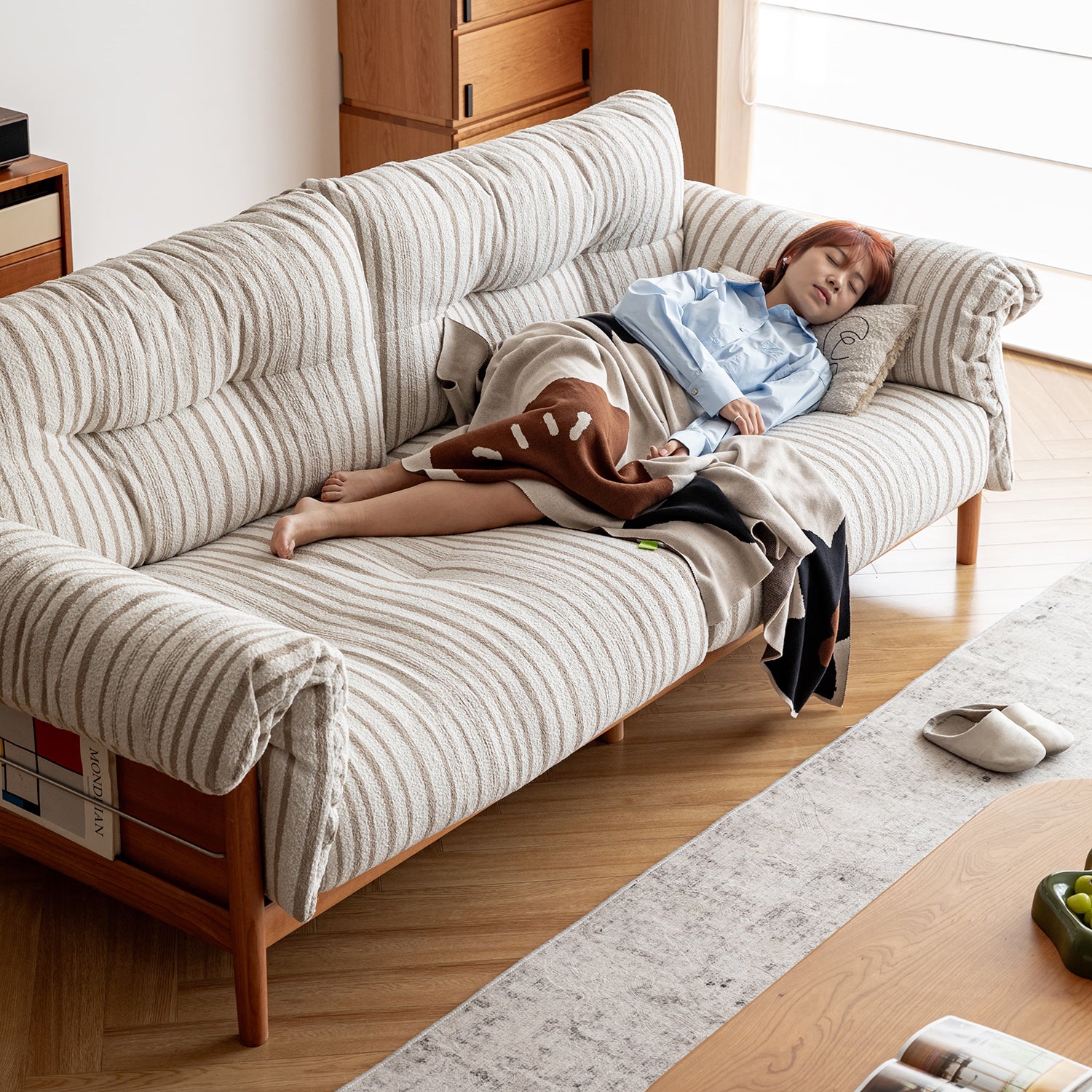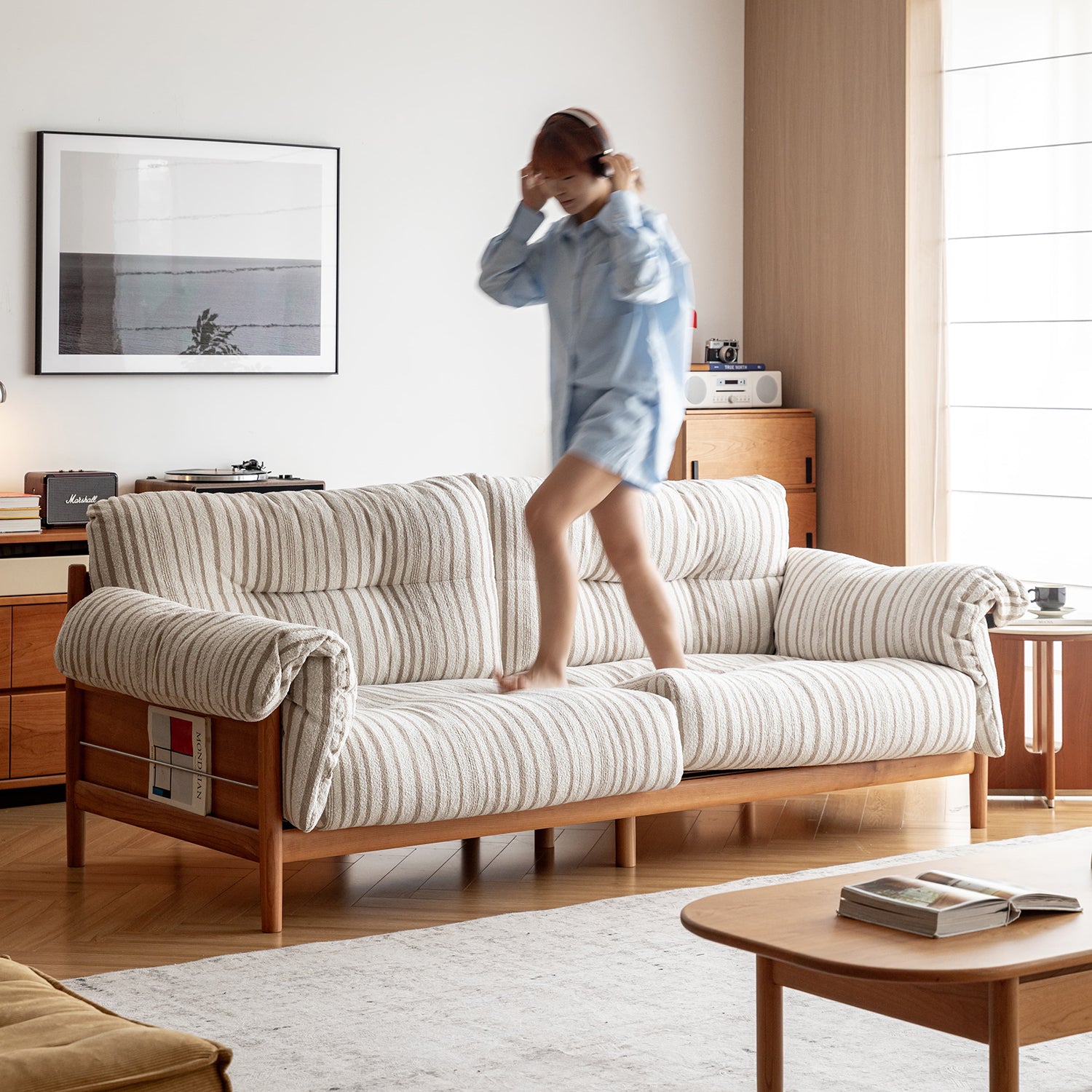 Crafted with solid North American cherry wood the sofa’s sturdy open back frame highlights natural wood grain and provides long lasting durability and elegance. |