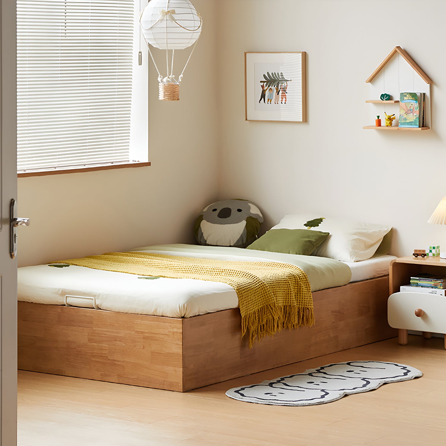 Scandinavian Rubber Wood Kids Storage Bed MIREO combines the strength of solid rubber wood with smart underbed storage, creating a safe, space-saving, and stylish bed for modern kids' rooms.