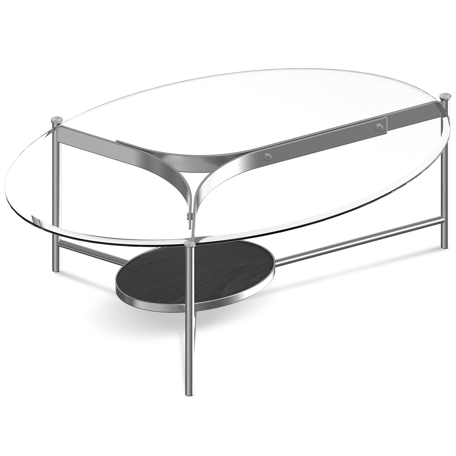 This coffee table features an elliptical glass top with a clean stainless steel frame, creating a light and open look that blends easily into modern living spaces.