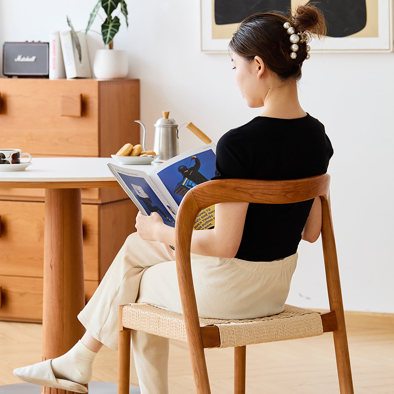 Scandinavian Cherry Wood Woven Rope Dining Chair SONA combines warm cherry wood with breathable woven seating, offering natural comfort and timeless Scandinavian style for dining spaces.