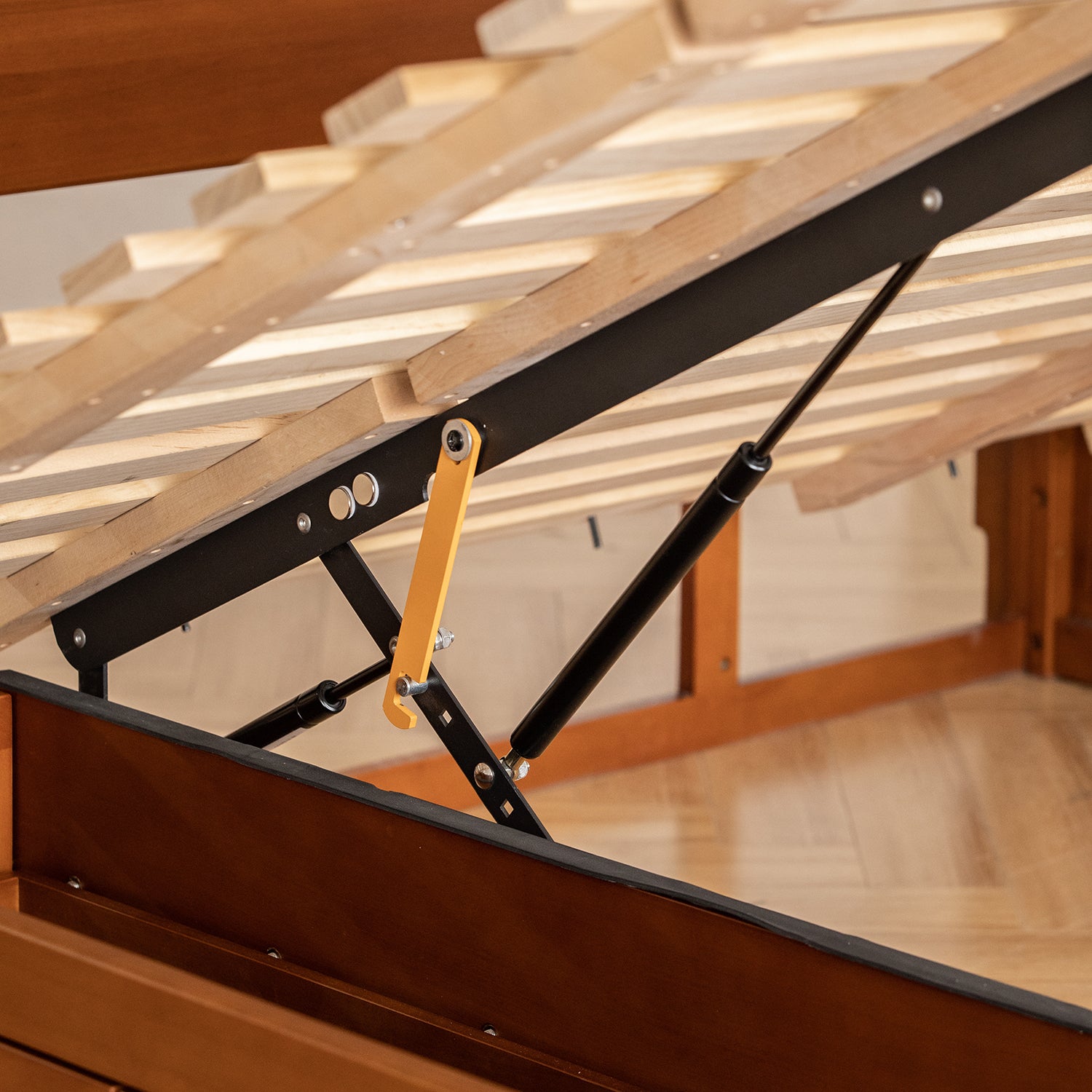 The lift-up platform opens smoothly to reveal a generous hidden compartment, ideal for storing extra bedding, clothing, or luggage. |