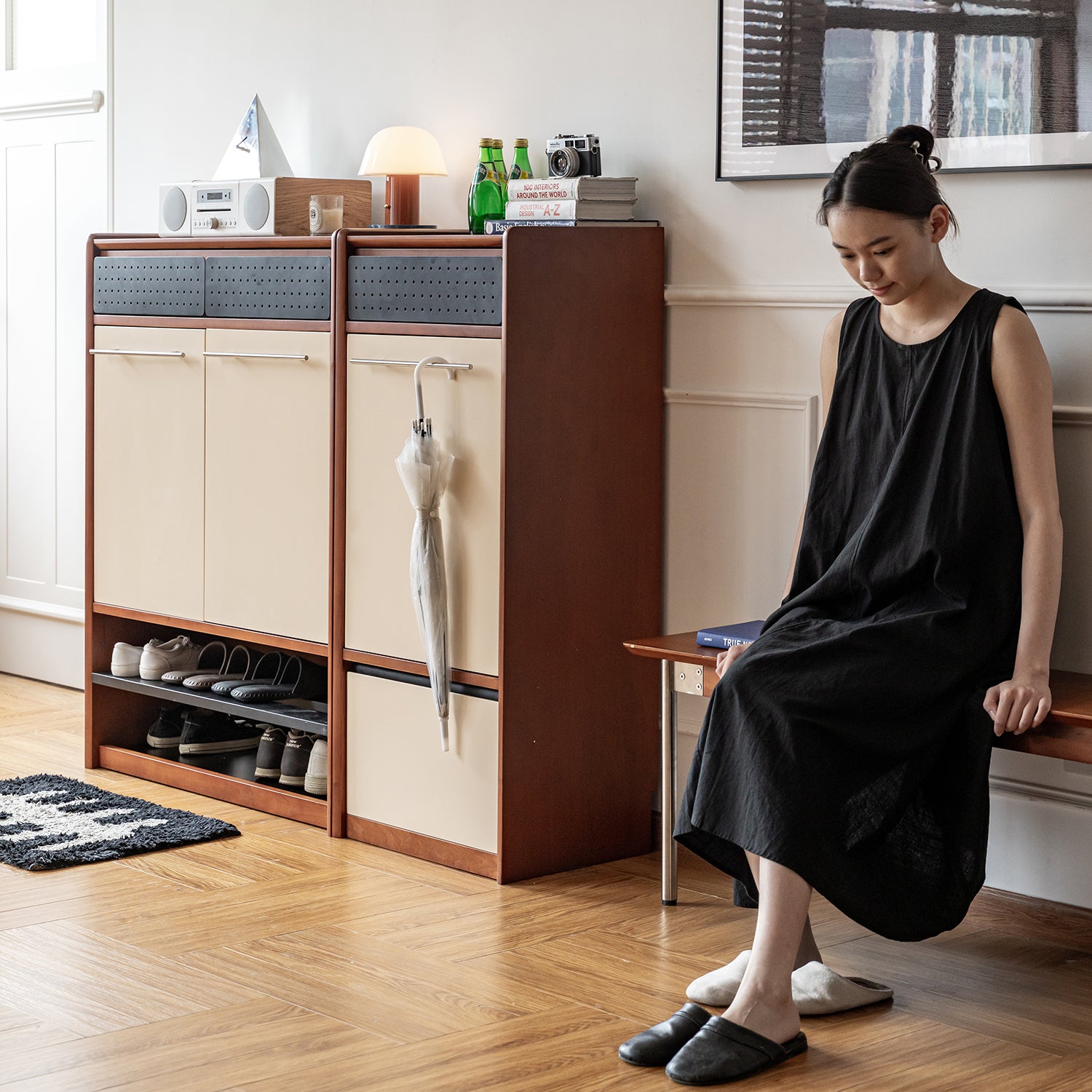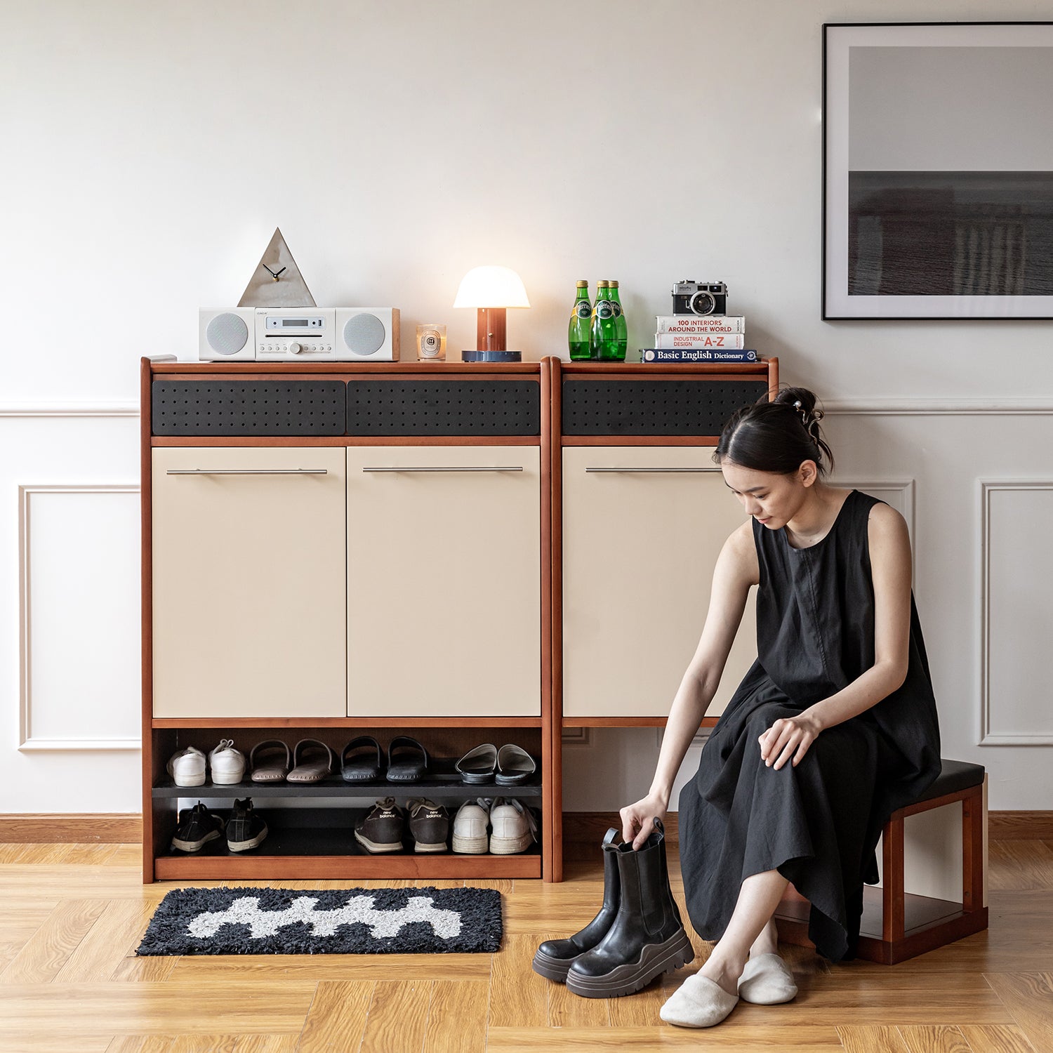 Features a seamless cream beige cabinet front that creates a clean and cohesive look, helping your entryway feel calm, tidy, and visually spacious. |