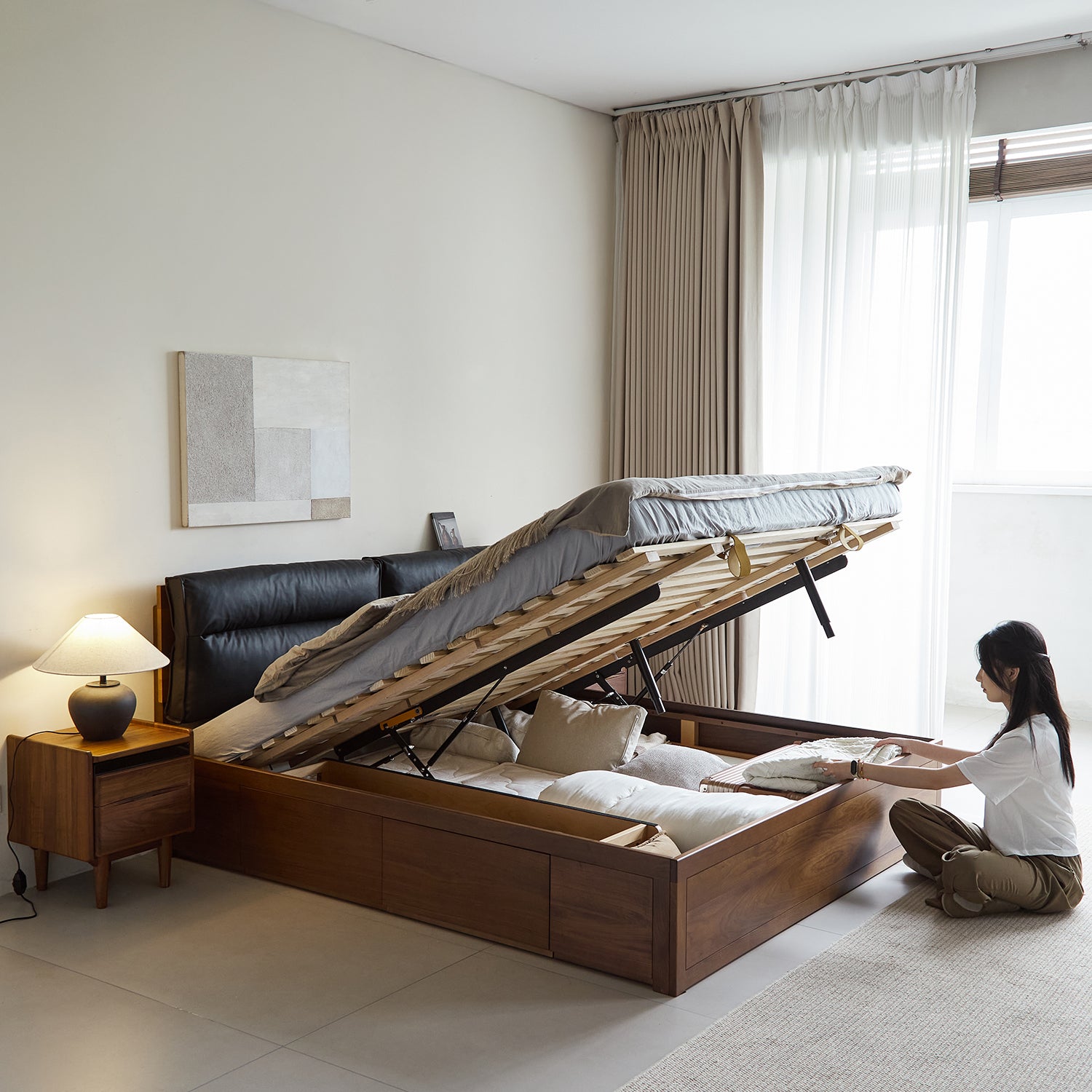 Features a deep 1100L storage compartment and smooth lift up system, providing generous space to store bedding, luggage and essentials neatly. |